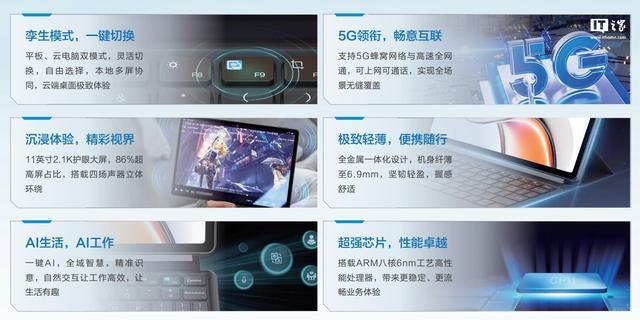 软件方面,该机内置基于安卓的星云 AIOS 系统,提供一键 AI 入口,同时用户按一下 F9 键,就能在 Windows 云电脑和安卓平板之间切换,适合偶尔生产力需求。